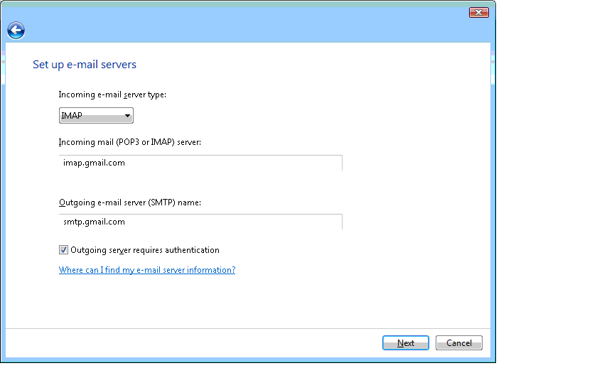 4) Choose IMAP input given servers, and check 'Outgoing server requires authentication'; click Next.